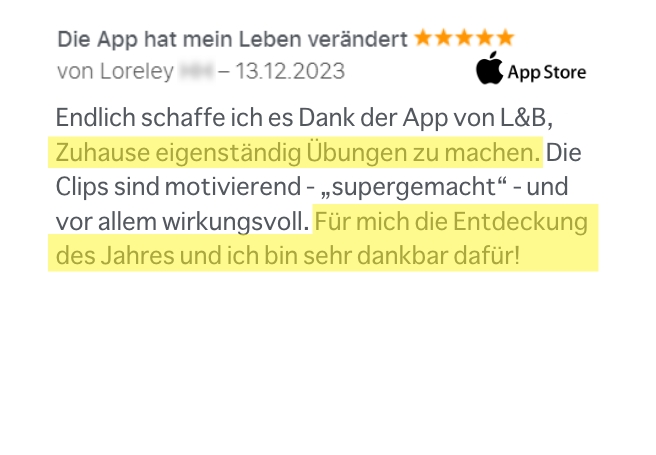 Du wirst in unserer App nicht allein gelassen, sondern an die Hand genommen: Solltest du beim Üben Schwierigkeiten oder Fragen haben, kannst du in unserem Community-Feature deine Fragen an Zertifizierte Liebscher & Bracht Therapeuten stellen, die dir weiterhelfen. In allen Videos leitet dich Roland immer genau an – du kannst immer nach deinen eigenen Bedürfnissen üben und dein eigenes Tempo wählen.