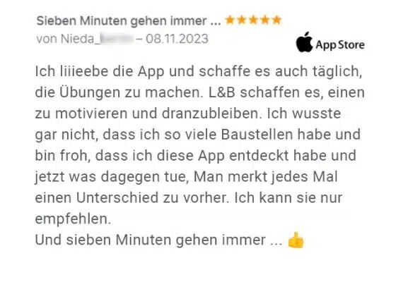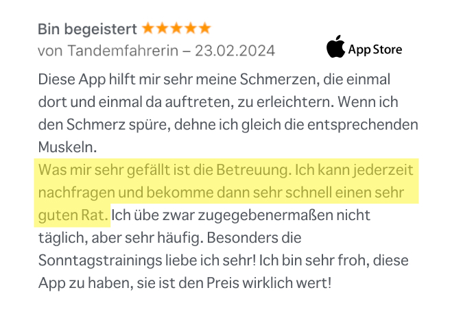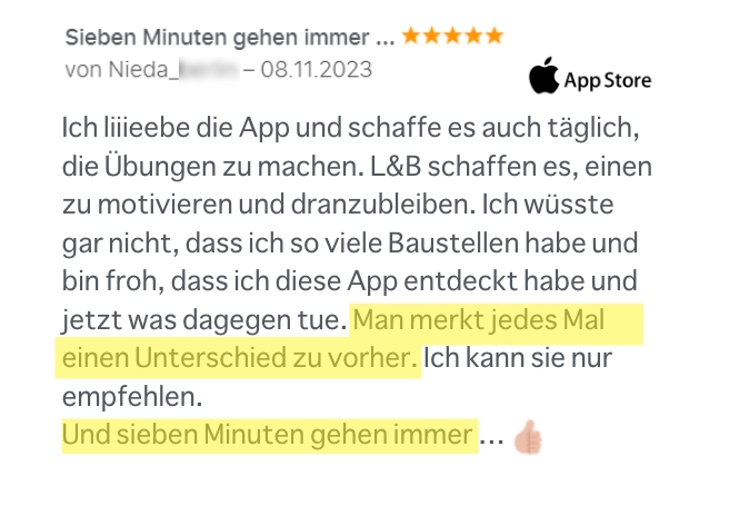 Viele Mitglieder unserer App-Community sind bereits in einem höheren Alter. Auch wenn ihnen die Übungen anfangs nicht leichtfallen mögen, geben sie nicht auf: Sie tasten sich nach und nach weiter vor und machen die Übungen regelmäßig.