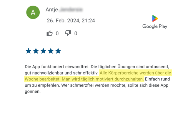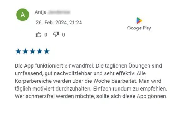Neben den täglichen Motivations-Einheiten gibt es zu jedem Schmerz- und Körperbereich weitere Übungsvideos, um deine individuellen Schmerzen gezielt zu verringern. Unsere Dehn- und Kräftigungsübungen in der einzigartigen, bewährten 3-Schritt-Technik sorgen dafür, dass du dort ansetzt, wo Schmerzen oft entstehen. Dadurch kannst du Beschwerden auch vorbeugen. Diese Art der Dehnung haben wir über mehrere Jahrzehnte weiterentwickelt, zahlreiche Menschen mit Schmerzen berichten immer wieder von ihren Erfolgen damit.
