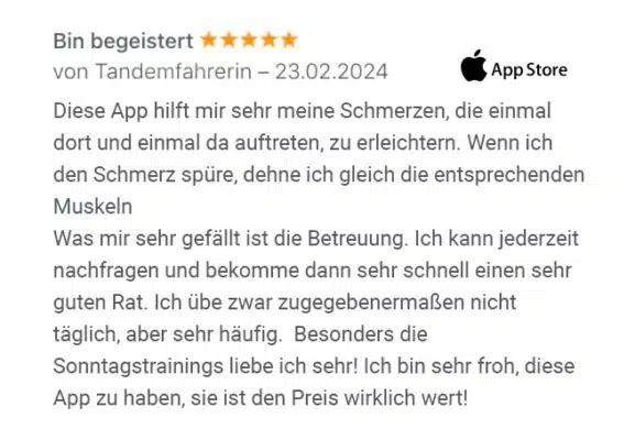 Egal ob jung oder alt, körperlich stark eingeschränkt oder sehr beweglich – unsere App und alle darin enthaltenen Übungen sind für jede Person geeignet, die aktiv etwas für ihre Schmerzfreiheit und Gesundheit tun möchte.